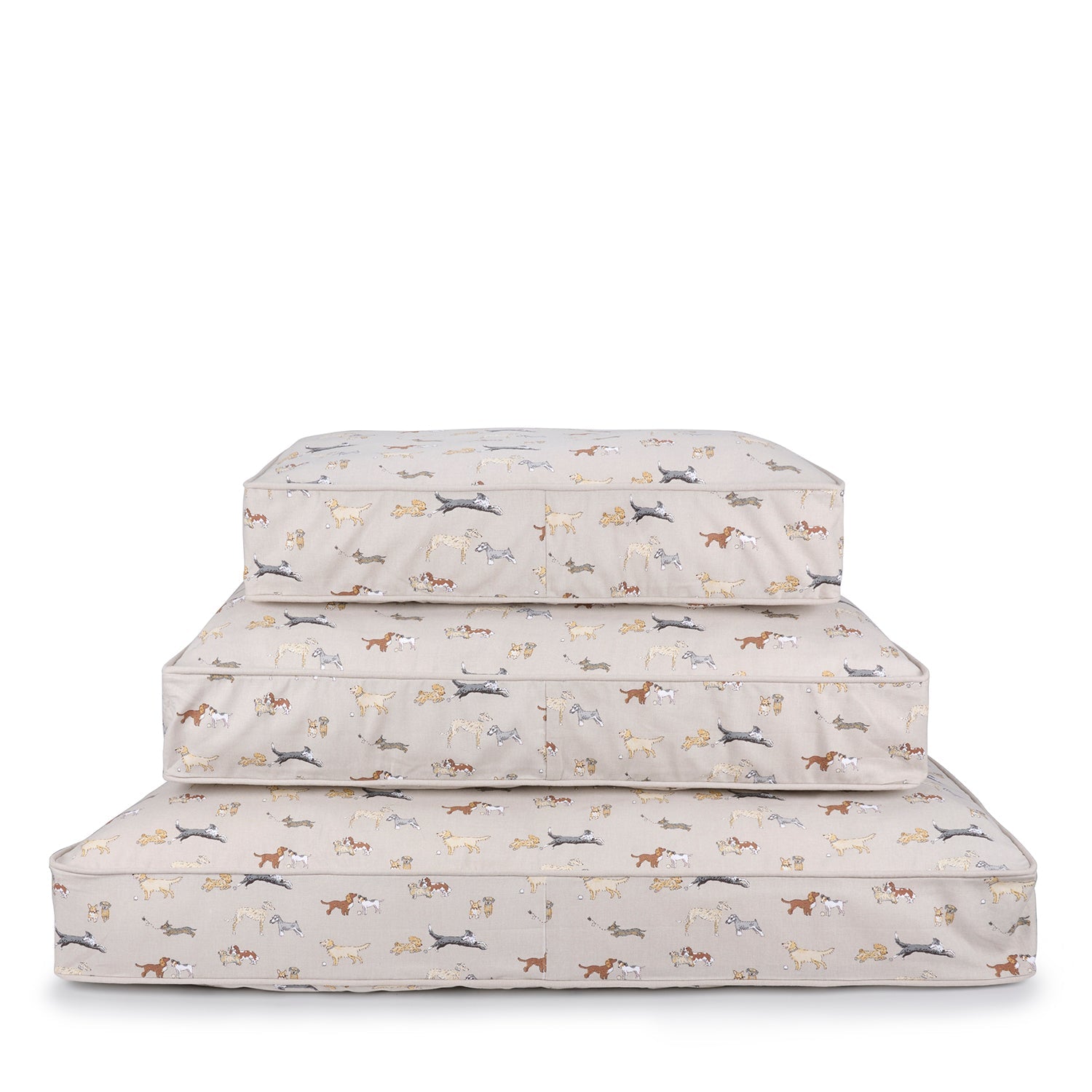 This cosy pet mattress cover will add a soft. stylish statement to any home and features Sophie’s Doggy Daycare design. which captures the lively personalities of 12 adorable doggies on a warm stone background. From playing fetch and exploring with sticks to wagging their tails alongside their friends. this sweet dog mattress cover includes; border collies. cockapoos. corgis. border terriers. spaniels. king Charles spaniels. schnauzers. golden retrievers. lurchers. wire-haired dachshunds. jack russells and Norfolk terriers. Available in three sizes. your pooch will have enough room to stretch out and snooze. This practical removable zipped cover can be machine washed when it gets mucky.
