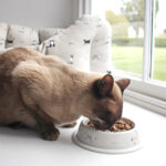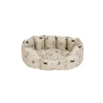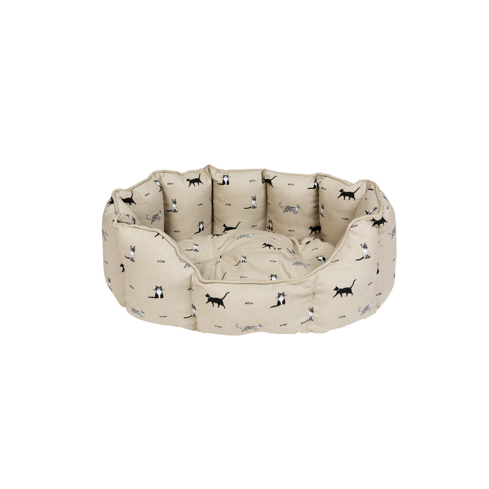 Our oval-shaped cat pet bed features deep filled fibre shoulders for enhanced comfort with drop down front for easy access. A super cosy bed for your cat to curl up in. Made from our hard wearing cotton ‘Purrfect’ cat fabric it is covered in black. tabby. Siamese. ginger and black & white cats on a wheat beige background. There are some fun grey fish bones dotted between the cats.
