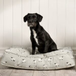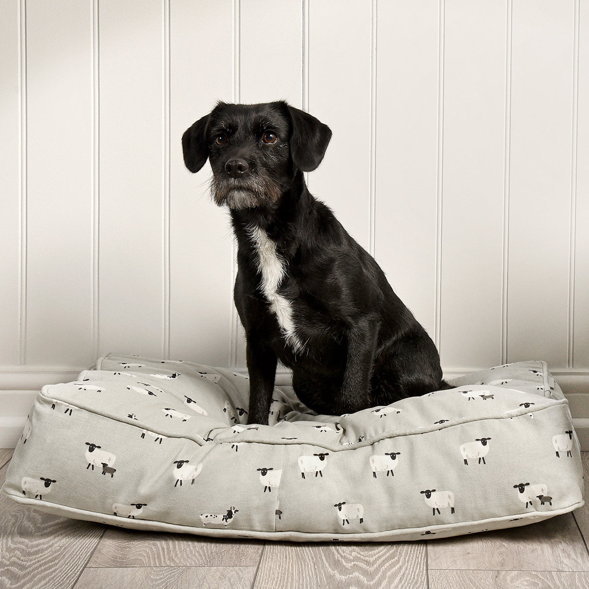 Made from our hard wearing cotton Sheep fabric on a grey coloured background. There’s a practical removable. zipped cover. so you can machine wash it when it gets mucky.